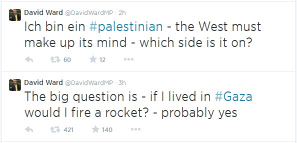 So we arrive at July 2014, when Ward tweeted “The big question is – if I lived in #Gaza would I fire a rocket? – probably yes”. So, with this incitement to violence, Ward was making clear that rather than supporting an unconditional ceasefire, which would lessen the suffering of both sides, he would fire a rocket (indiscriminately and with the sole intent of killing any Israeli, although of course he didn’t mention that bit). He followed that up with “Ich bin ein Palestinian – the West must make up its mind – which side is it on?”, which once again uses German…it is quite amazing how up with German left-wing critics of Israel are these days!