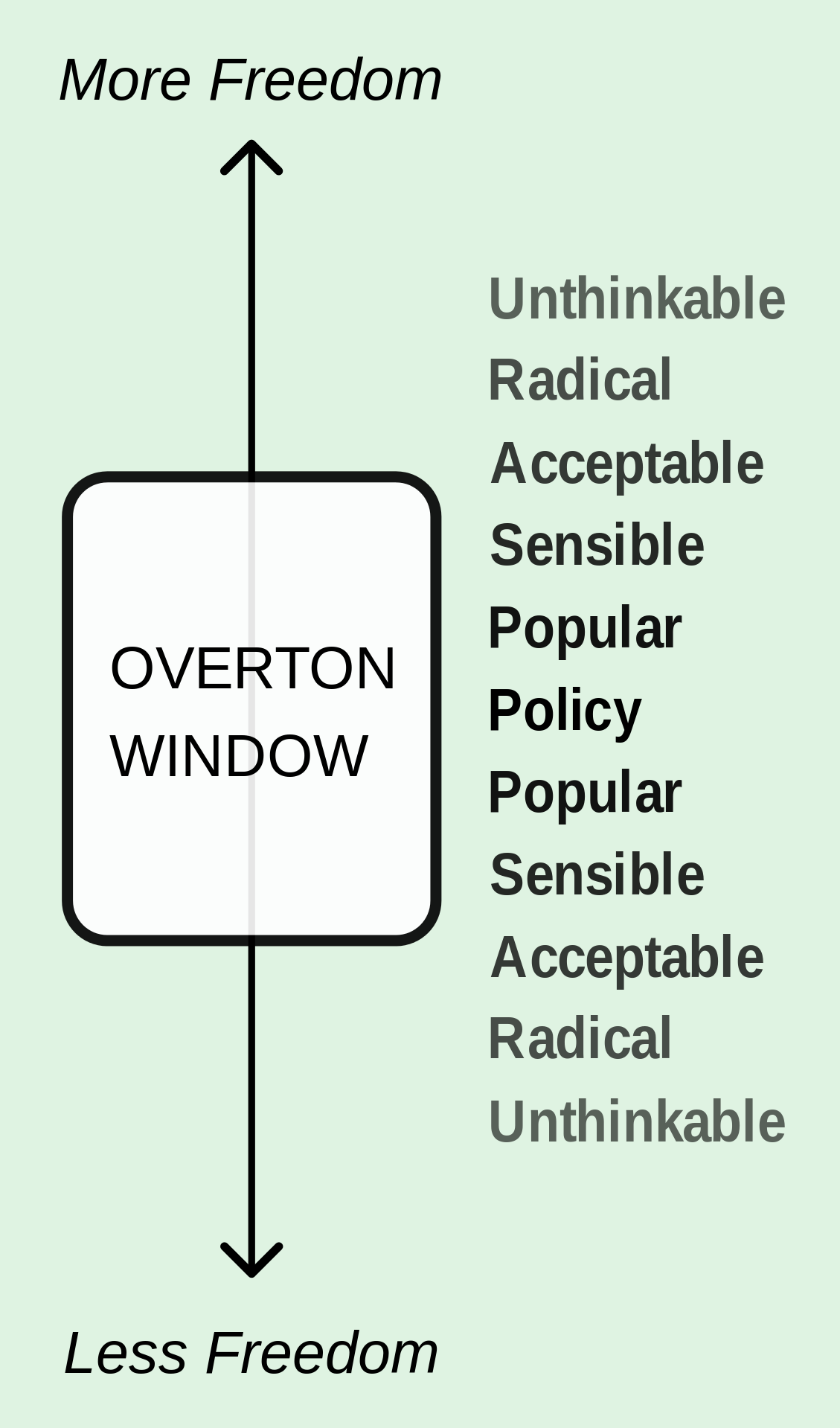 The Overton Window derives its name from Joseph P. Overton, a former vice president of the Mackinac Center for Public Policy in the USA. Overton suggested that the way to ascertain a policy’s viability is if it falls within the window of discourse. This includes the range of policies considered politically acceptable in the current climate of public opinion, which a politician can recommend without being considered too extreme to gain or keep public office. Overton suggested you could put these ideas on a spectrum – which he suggested was from “more freedom” to “less freedom”, in order to not make people think it was about ‘left and right’. Political commentator Joshua Trevino then came up with some degrees of acceptance, which are, roughly – Unthinkable, Radical, Acceptable, Sensible, Popular, Policy.
